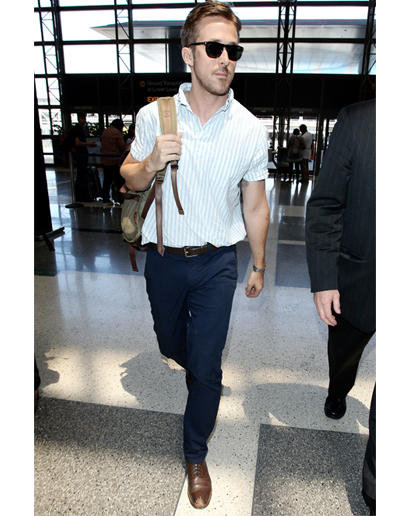 Few if any look as stylish as Ryan Gosling, take for example the picture above as he strolls through the airport on the way to Cannes Film Festival. Here is sporting some wayfarer sunglasses, slim fit navy pants, and Gant short sleeve shirt. Notice how he put his own touch on the shirt? Look at the sleeves he casually rolls the sleeves up a touch to give it his own look. Then he adds to this look by wearing some beat up brown boots that puts some character into the whole outfit. You may not look like Ryan but you can take some cues from his style to be a more distinguished you.